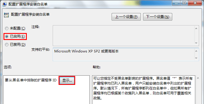 6. 點選左邊第二項“已啟用”,點擊下面的“顯示”,