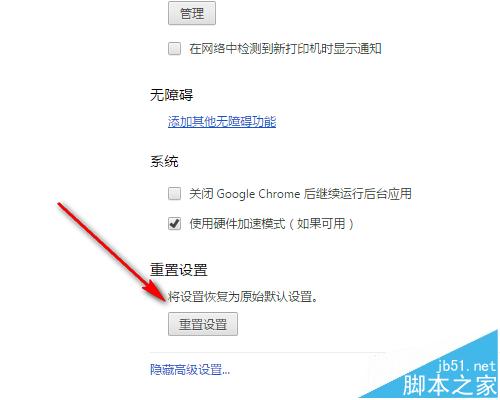 6、找到高級設置頁面最下方的‘重置設置’欄目,在該欄目中單擊‘重置設置’按鈕