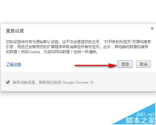 7、在彈出的對話框中點擊‘重置’按鈕,將瀏覽器重新設置為原始狀態