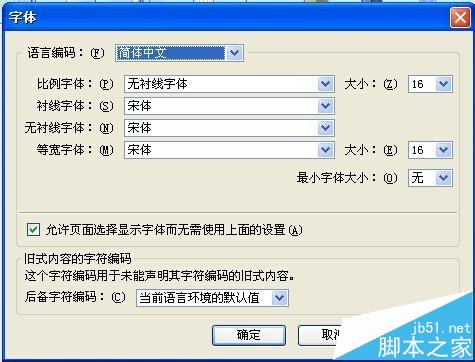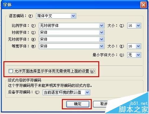 5、我們需要的就是把“允許頁面選擇顯示字體而無需使用上面的設(shè)置”前面勾選去掉,然后點擊確定: