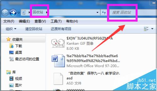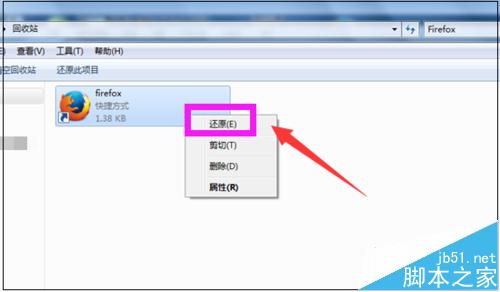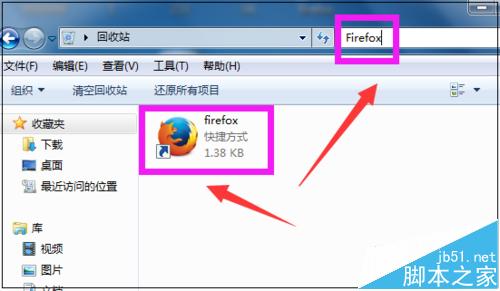 1、桌面上的火狐瀏覽器圖標不小心被刪除了,會刪除到回收站,點擊打開桌面上的回收站,如果這里刪除的內容較多,不容易找到firefox,可以點擊右上角的“搜索”輸入框。