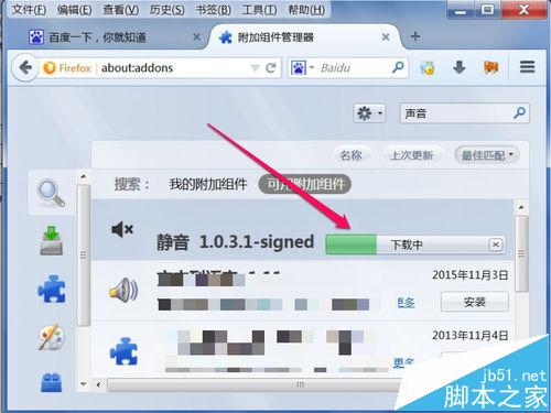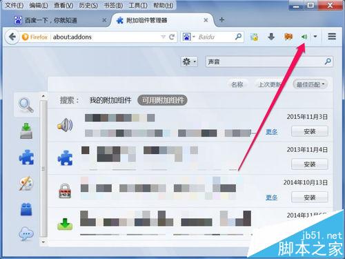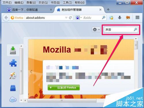 3、進入附加組件管理器窗口,在搜索框中,輸入“聲音”二字,然后點搜索圖標。