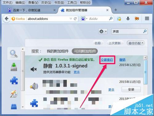 6、安裝完成后,需要重啟火狐瀏覽器,才能生效,按“立即重啟”按鈕即可。