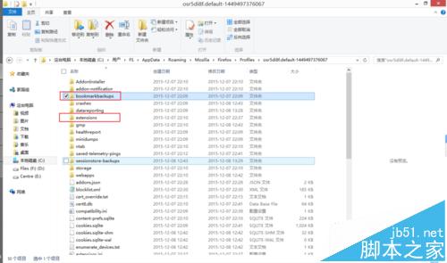 3、新打開的文件夾中包含了許多的文件和文件夾,bookmarkbackups 文件夾保存了我們的書簽,extensions 文件夾保存了我們安裝的擴展。