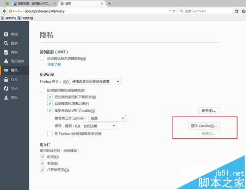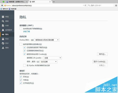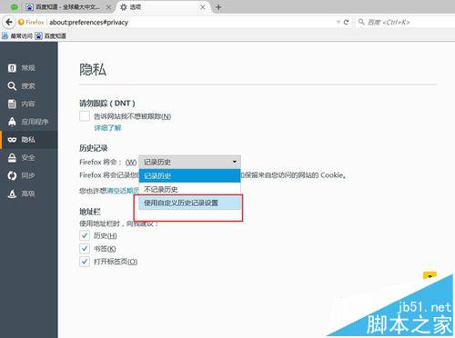 3、然后依次找到“隱私”以及“歷史紀錄”下面的“使用自定義歷史記錄設(shè)置”