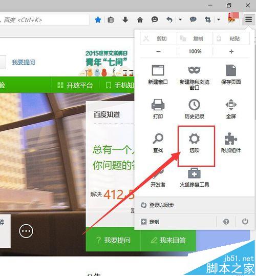 2、我們可以先嘗試清楚瀏覽器的COOKIE試一下,我們點擊火狐瀏覽器右上角的設(shè)置,然后點擊里面的“選項”。