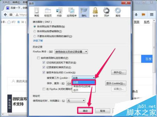 6、選擇使用自定義歷史記錄設置后,就會自動打開其選擇項目,將其中接受第三方Cookie設置為“總是”即可,然后按“確定”保存。
