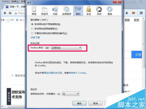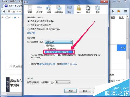 5、在下拉框中,選擇“記錄歷史”或者“使用自定義歷史記錄設置”,它們的分別是,記錄歷史會記錄所有的東西,而且自定義,只會記錄自已所選擇的項目,建議使用自定義。
