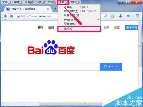 1、先打開火狐瀏覽器,在菜單欄中,打開“工具”,從彈出菜單中選擇“選項”這一個。