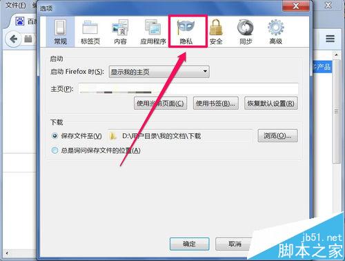 3、進入選項設置窗口后,選擇“隱私”這個選項卡,打開這個界面。