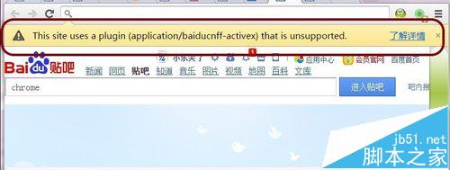 1、如果你用Chrome瀏覽器打開百度貼吧,可以發現上方出現一個提示:此網站所用的插件application/baiducnff-acticvex不受支持