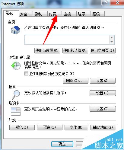 3、進入Internet屬性對話框,點擊上方【內容】選項