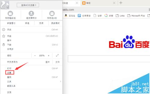 2、首先我們打開UC瀏覽器電腦版,點擊它的左上角圖標在彈出的下拉列表里選擇“設置”