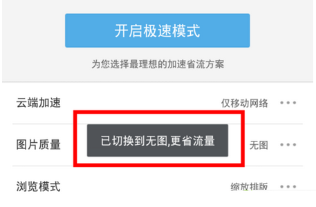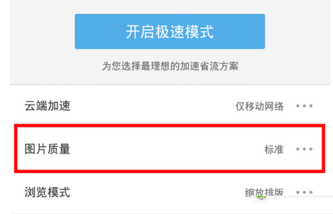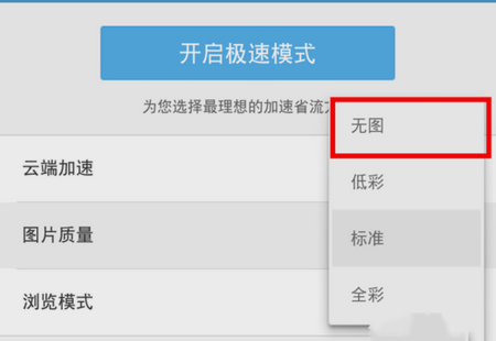 進入極速省流頁面之后,點擊“圖片質量”選項,然后將圖片質量設置為“無圖”。