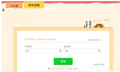另外值得注意的是,在本次購票專題頁面上,還有一個全新的“拼車”選項出現,其功能鏈接到百姓網的拼車服務頁面,用戶可以通過搜索同路或順路的老鄉拼車回家,這種模式對于坐慣了火車的乘客來說無疑是又多了一種安心回家方式。據悉,360瀏覽器還即將推出購買飛機票、輪船票等多元化的購票渠道。