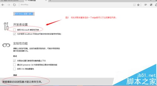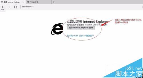 2、關閉Microsoft Edge使用Internet Explorer打開網站的提示,如果在使用edge的過程中,不想收到使用 IE 打開這個網站的提示,就可以將“使用 Microsoft 兼容性列表”取消取中即可,這樣如下圖所示的提示就不會看到了。如果經常使用網銀,建議保留此選項,如圖