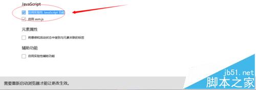 3、開啟asm.js提高執行速度:一些依賴于JavaScript 的網站或者網絡游戲,在開啟 asm.js 之后,會使效率提高。因此,可以在“實驗性功能”中找到 JavaScript ,將其包含的兩個選項選中,重啟瀏覽器即可生效,如圖: