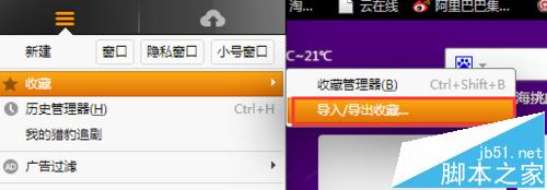 3、鼠標移動至收藏的時候,選擇導入/導出收藏,點擊導出收藏。