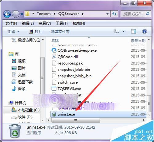 5、打開這個文件夾之后,可以看到這個文件夾中就是瀏覽器的安裝目錄。我們用鼠標點擊最下面找到uninst.exe的這個程序,這個就是這個軟件的卸載程序。如果我們不想使用這個瀏覽器的話,就可以雙擊運行這個卸載程序進行卸載。
