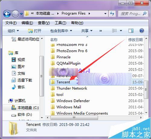 3、接著在打開的文件夾中找到Tencent的文件夾,這個文件夾就是qq瀏覽器的默認安裝位置。它的qq一樣都是安裝到這個文件夾中的。