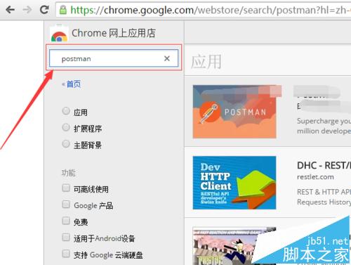 3、這樣就直接進入到chrome網上應用店,由于程序較多只能通過搜索的方式進行,在輸入框中輸入postman。