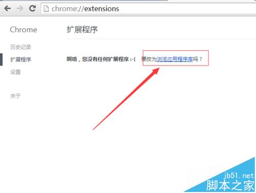2、進入到谷歌瀏覽器的設置的選項框中進行,點擊擴展程序中,因沒有安裝任何的程序,進行點擊“瀏覽器應用程序庫”。
