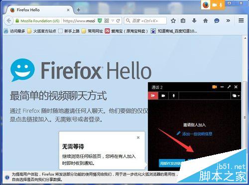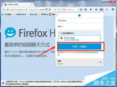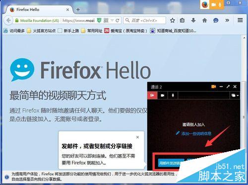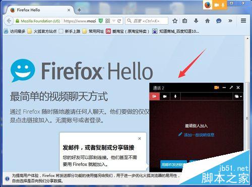 我們如果需要和好友視頻聊天的時候,通常比較多的是利用聊天工具軟件,比如qq等,那么,如果電腦上沒有安裝類似qq這種聊天工具該怎么實現視頻聊天功能呢?其實,火狐瀏覽器就提供了一個自帶的視頻聊天功能,只要你使用該視頻聊天功能,并將鏈接發送給你的好友,好友就可以使用任何網頁瀏覽器來實現與你的視頻聊天,非常方便。