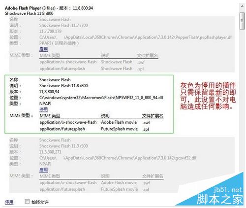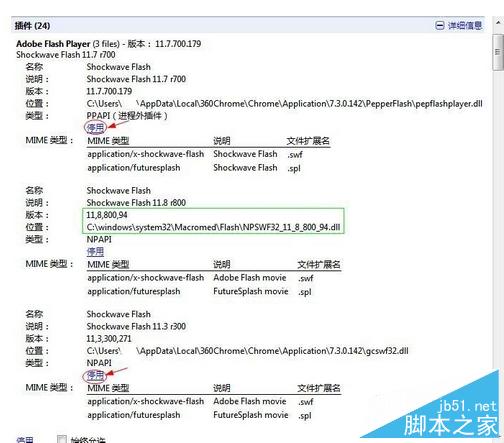 3、找到Adobe Flash Player或者Flash插件項(一般第一個就是),停用所有的Shockwave Flash,只留下剛剛安裝的版本11.8,其他所有東西都不用改動