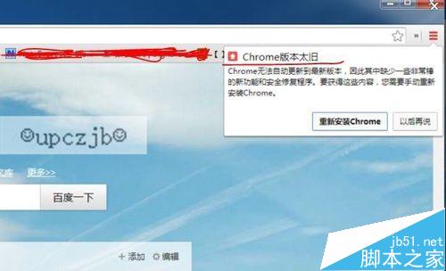 1、如圖所示谷歌瀏覽器右上角自動彈出圖示文字框,點擊重新安裝chrome