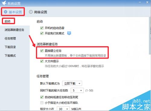 4、系統設置的基本設置中,我們在啟動里面,這里我們選擇瀏覽器新建任務中的直接建立任務,如圖所示,進行操作。