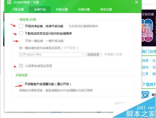 5、找到 安裝升級標簽欄 去掉所有的打鉤,防止360衛士自動升級瀏覽器。