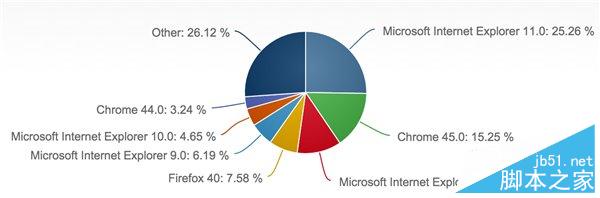 具體到瀏覽器版本,IE11瀏覽器以25.26%的份額位居第一位(8月份數據26.9%),Chrome 45以15.25%的市場份額位居第二。IE8以11.71%的份額排名第三(8月份為10.92%,下降明顯)。Firefox 40從9月份開始,以7.58%的市場份額排行第四。