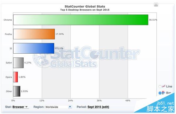 另一份來自StatCounter的統計數據則顯示:Chrome瀏覽器名列第一,市場份額56.51%,與8月份數據持平。Firefox火狐瀏覽器在9月份開始,以17.34%的市場份額躍居第二位,也算是史無前例。IE瀏覽器市場份額17.11%,8月份同期數據為17.51%,雖然市場份額下降不大,但排名卻跌至第三名。Safari瀏覽器市場份額為4.27%,7月份份額為4.17%,小幅上升。第五位的Opera市場份額為1.84%,8月數據1.86%,同樣也是小幅下降。