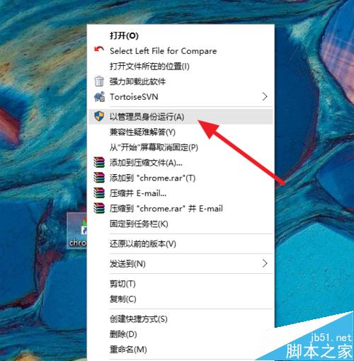 1、右鍵點擊chrome的快捷方式,并在出現的菜單中找到以管理員身份運行。