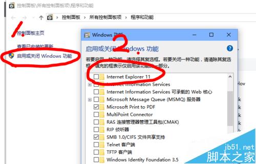2、之后在控制面板上左側(cè)選擇“啟用或關(guān)閉 Windows 功能”,然后把IE11之前的鉤鉤給去掉,關(guān)閉IE