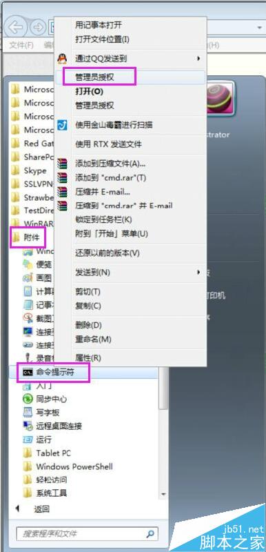 2、依次點擊“開始”—“所有程序”—“附件”,右鍵點擊“命令行提示符”,選擇“以管理員身份運行”,64位操作系統是”以管理員身份運行“。我的操作系統為win7 32位操作系統,選擇”管理員授權“。