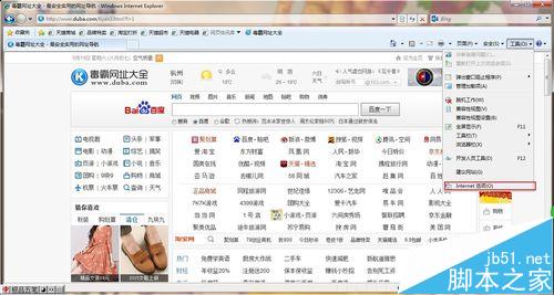 2、然后我們在點擊下拉三角會跳出一列選項我們找到"Internet選項",點擊這個“Internet選項”。
