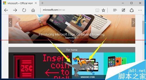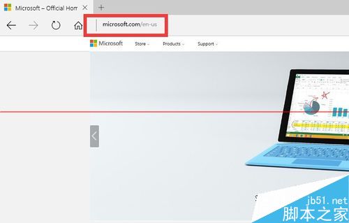 1、首先,打開(kāi)Win10Edge瀏覽器,在地址欄輸入“微軟官方網(wǎng)站”(英文版:microsoft.com/en-us),如圖所示: