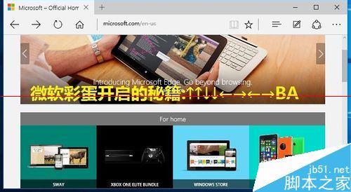 4、待進(jìn)入“微軟英文官方網(wǎng)站”主頁(yè)后,需要再輸入“秘籍”才能查看“微軟彩蛋”頁(yè)面,開(kāi)啟“微軟彩蛋”畫面的“秘籍”是“↑↑↓↓←→←→BA”,其中“箭頭”表示鍵盤上的方向鍵。