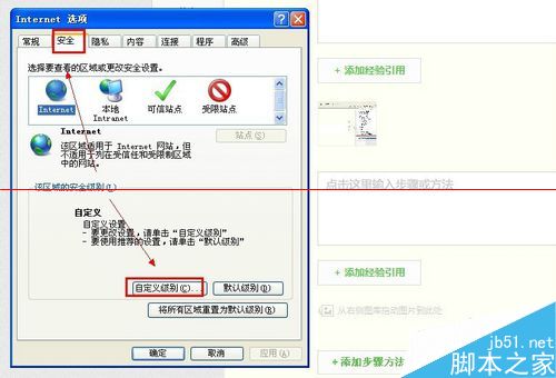 3、在“安全”標(biāo)簽下,找到“自定義級(jí)別”的按鈕。