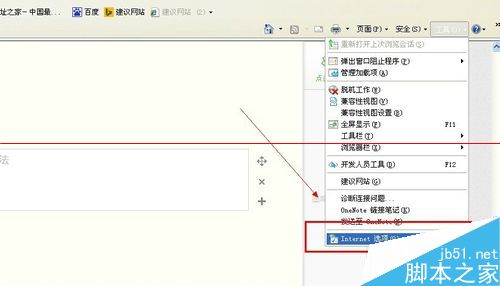 2、在“工具”下拉菜單中找到“internet選項(xiàng)”,在菜單的最下端,如下圖所示。