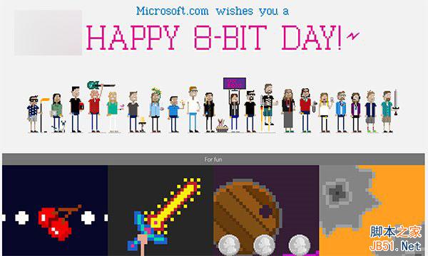 打開之后,就會看到微軟在網頁上方給出的“微軟官網祝你8位節快樂”的字樣,下面有各種8位人物形象以及經典8位游戲圖標。點擊之后會打開必應給出對應搜索信息。