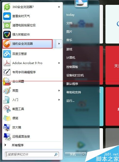 1、打開。先要找到并點擊打開獵豹瀏覽器,每個人圖標(biāo)放置的位置不同,這里是從開始菜單里找到并打開的。