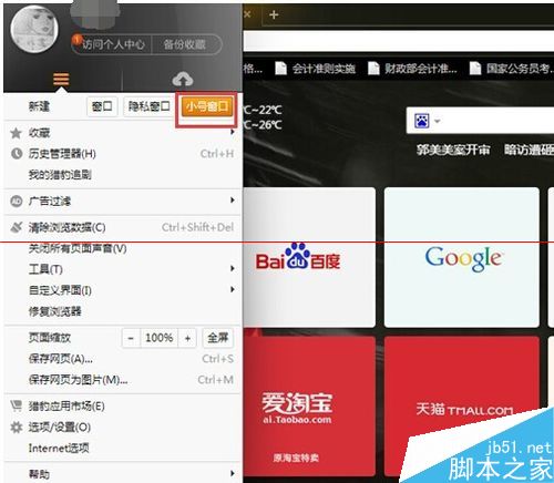 3、找到小號窗口。點擊左上角的圖標(biāo),會出現(xiàn)一個下拉菜單,在這個下拉菜單中,可以在上面很容易發(fā)現(xiàn)”小號窗口“字樣。