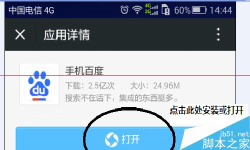 3、已經安裝手機百度應用軟件的,可以直接打開。未安裝手機百度軟件的進行安裝。