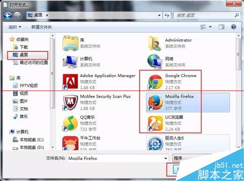 2、默認程序設置。不要勾選始終使用選擇,點擊瀏覽,在桌面選擇瀏覽器點擊打開。