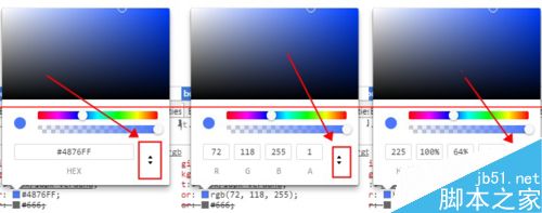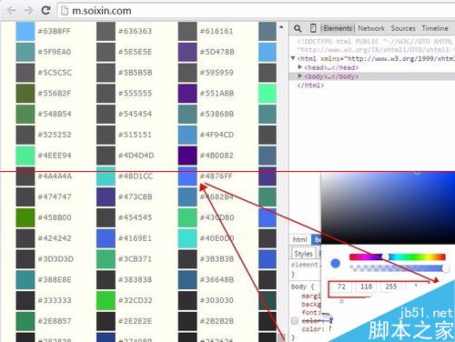 2、用瀏覽器自帶的顏色代碼調色工具將顏色轉換為HEX和RGB還有HSL三類格式顏色代碼,下面是轉換的對照表,大家可以看下的效果