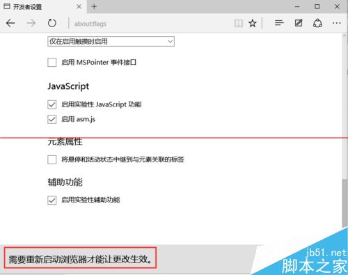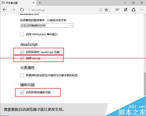 2、在開發者設置找到并勾選:啟用實驗性JavaScript功能,啟用asm.js和啟用實驗性輔助功能三個選項: