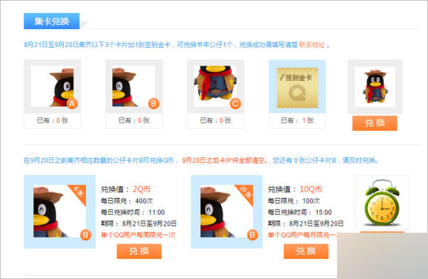 2. 在規定期限內集齊1套卡片可兌現對應獎品,集齊規定數量的B卡片可以兌換Q幣,該期限結束后所有卡片清零,請及時兌換。