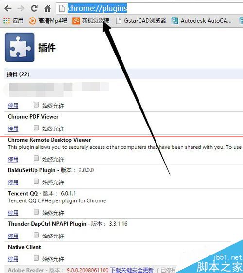 2、解決方法也很簡單,打開瀏覽器,我們在瀏覽器的地址欄,也就是輸入網址的地方輸入“about:plugins”或者“chrome://plugins/”,不加引號,然后回車。